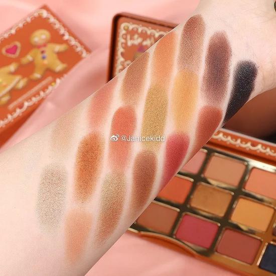 眼影是铁盒包装,很有圣诞氛围,上面图案也实锤了姜饼人夫妇的恋情,是一盘18色的眼影盘,里面的颜色超实用,舒服又特别,从大地色到南瓜色、蜜桃色、都有,哑光、珠光、亮片质地也很齐全,日常使用完全足够~推荐大家入手~