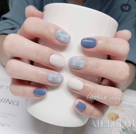 若喜欢温暖感重一些的,雾面绝对是首选!磨砂般的柔雾手感搭上云朵蓝,让色泽中的灰调更高调一些,搭上雾面裸白色或是加点格纹、花朵图腾点缀,更能让甲面带点文青感!喜欢简约一点的女孩,也可以试试以渐层跳色的方式搭配,简单不失庄重。