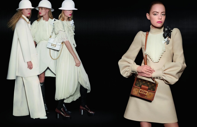 “美好年代”(Belle Époque)重绽光芒,路易威登推出新一季女装广告特辑,再现女装艺术总监Nicolas Ghesquière于2020春夏系列时装中所构造的时尚景观。在伦敦久负盛名的柏宁酒店,摄影师Collier Schorr用镜头定格一系列浪漫、前卫、爆发视觉冲击力的造型,使每一幕场景散发出心有灵犀的玄妙气息。路易威登品牌大使Emma Stone、品牌挚友钟楚曦与一众模特流连于装饰艺术风格的精美柱廊间,在这美妙华贵的幕景下,新一季LV手袋亦成为魅力四射的明星,其中包括Monogram印花版Vanity手袋和新款Dauphine手袋,Epi皮革与绒面皮革面料呈现迷人质感。
