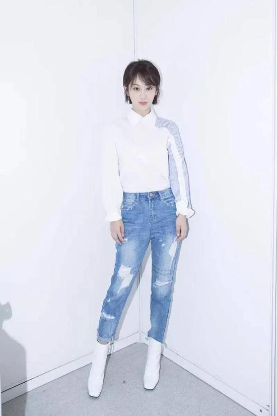 画风到90后这突然有了重大变化,杨紫利用不对称元素避免撞衫的尴尬, 再下搭破洞牛仔裤,脚踩白色短靴酷劲十足,蓝白look贼带感~