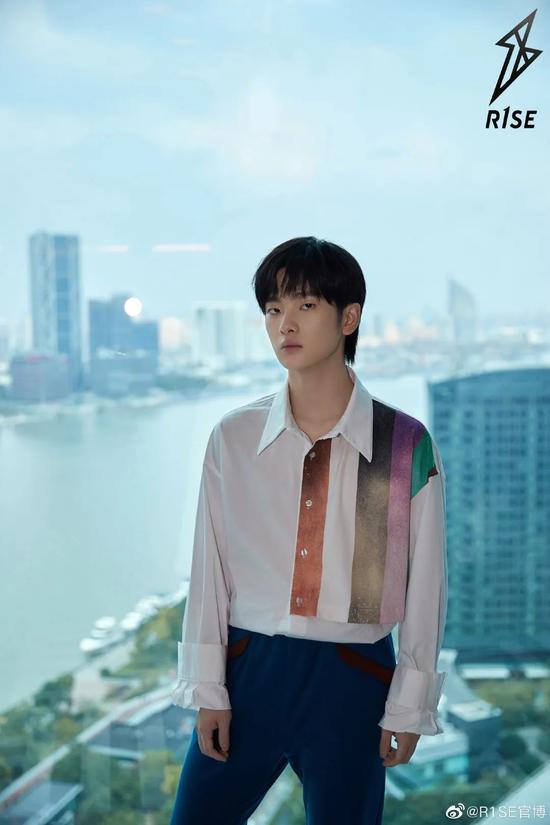 周震南所穿衬衣的渐变色条形的拼接装饰成为了亮点,细看其实每个条形中都是单色的细微变化,结合方正的形状,多色相接也不显得冗杂,大面积的白底和黑裤同样保证了造型的清爽,非常有特色和风格。