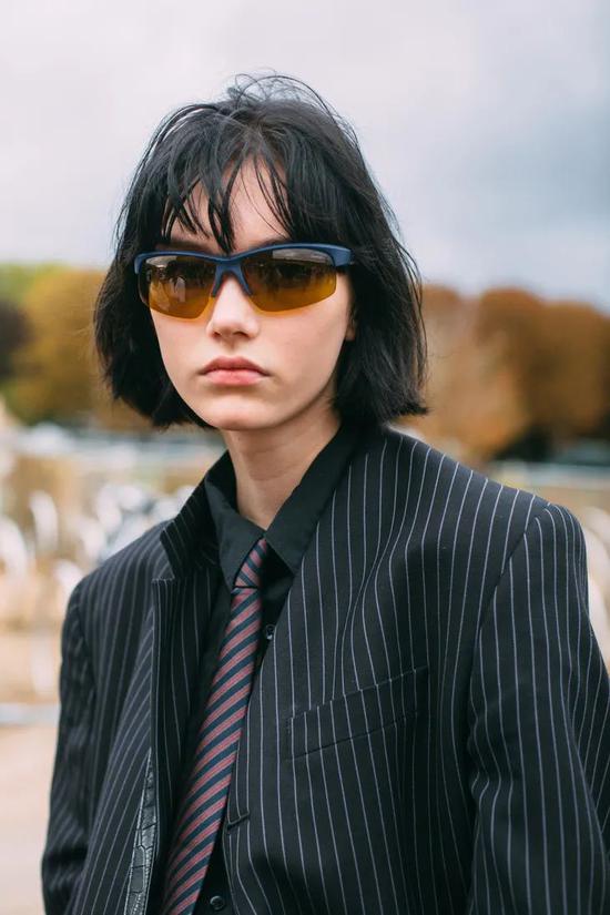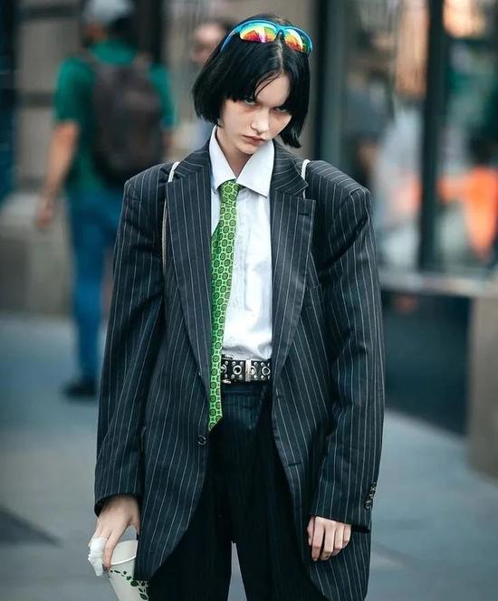要说把老爹风诠释得最好的,得把个性德国模特Sofia Steinberg拉出来。她在时装周街拍场上总是以宽大的衬衫+西服造型引人注意,千变万化的领带为她的造型增添了很多趣味。
