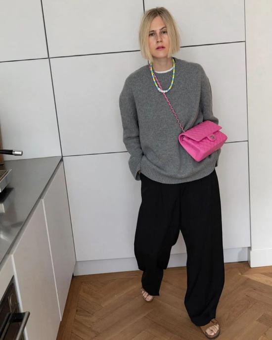 博主Diletta Bonaiuti 生活中也常穿,相比较用皮草、亮片、蕾丝营造出来的“华丽”,这个是不是看着没那么费力?