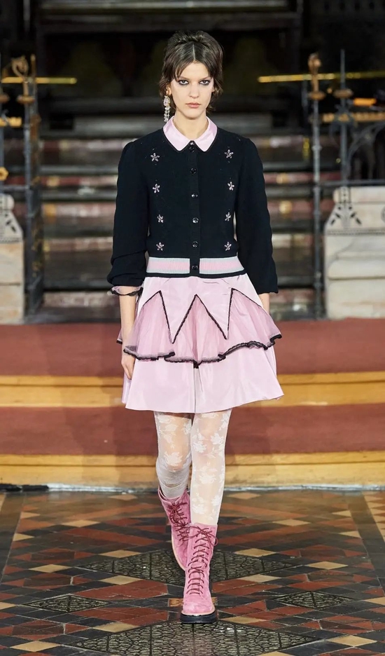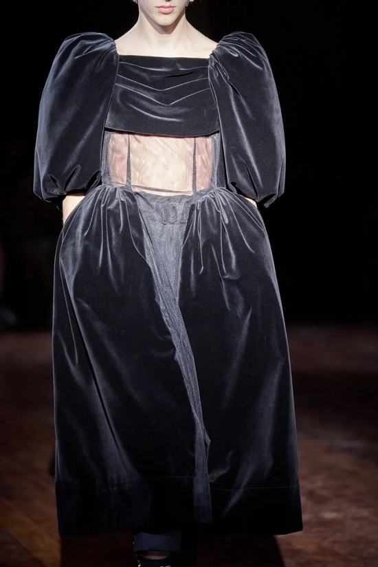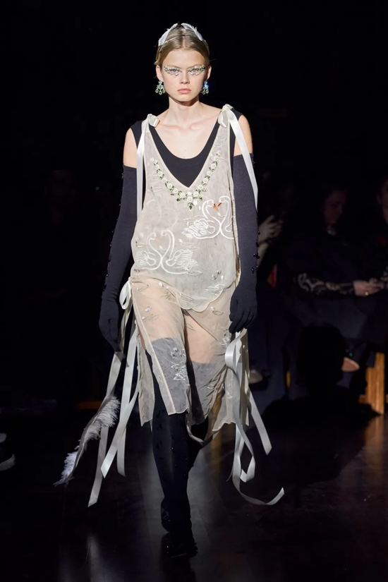 本季,Simone Rocha仍旧秉持自己最擅长的繁复美学理念,将膨大的廓形裙摆、唯美的薄纱蕾丝、复古的珍珠刺绣、浪漫的缎带印花等元素精致融合,构造出繁复的华丽感。
