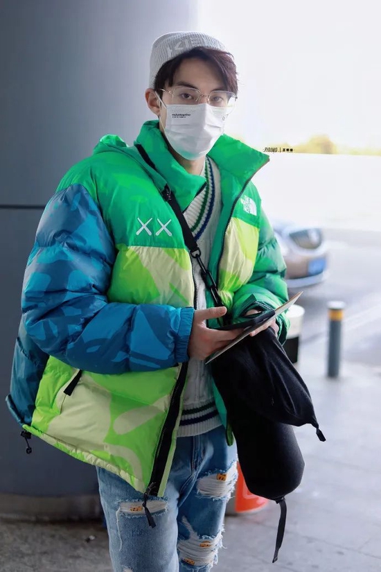 男明星中的穿搭王者王鹤棣青苹果味的学院风单品机场穿搭,他身穿 The North Face x Kaws 联名羽绒外套,内搭 Chester Charles 绿色条纹 V 领学院风毛衣,下半身穿着 drew house 破洞牛仔裤脚穿 Louis Vuitton Trainer 球鞋,佩戴 KENZO 灰色 Logo 毛线帽,冬日元气男大生学院风穿搭。