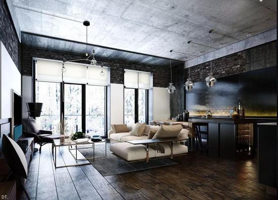 黑白灰的纯净色系,错综复杂的金属管道,不经装潢的水泥地面,不经粉饰的砖墙,随性、粗犷,不加修饰的风格却给人一种时尚摩登的视觉体验,甚至是展现了一种理性的独立型格调。