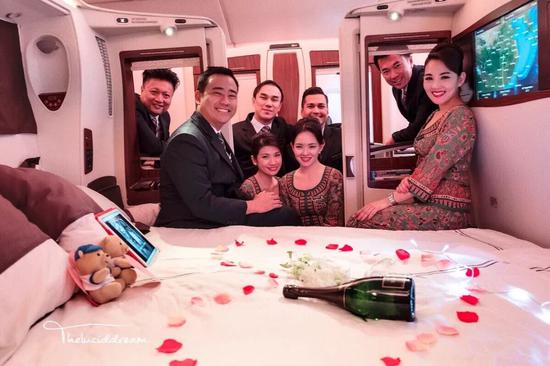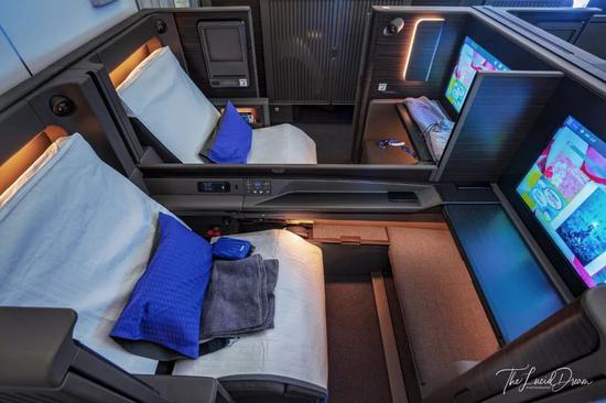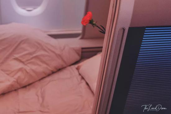 空中双人套间也是从A380时代才开始得以在民航客机上实现的产品,其知名度与空中浴室不相上下。双人床即为中间相连的两个座位,在平躺状态下可合二为一,方便情侣或夫妻一同出行。去年情人节,我搭新航老式的头等套房从新加坡回国,当天空姐出于对单身狗的人道关怀,特地铺了一张双人床给我独享。