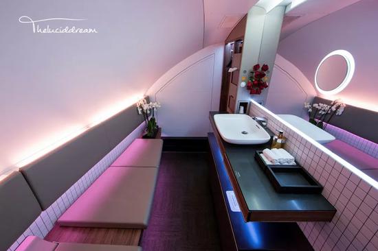 经常与新航空乘聊起空中浴室的事,从他们的解答中大概可以感到在新航的设计理念中浴室是没有必要的。因此,全新的A380客机依然没有引入浴室设计,取而代之的是面积更大的盥洗室,里面甚至还有一个化妆台呢。置身其中,难免会让人联想到电影《Crazy Rich Asians》里的某些场景了。