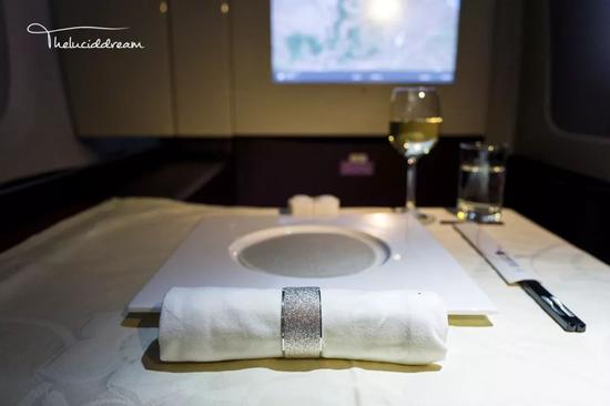 头等舱餐食除了有额外的鱼子酱之外,其余菜式同商务舱并无大差异,机上用品也是如此。在所有航司中,卡航A380的机上酒廊是我最喜爱的。酒廊位于客机上层中后部,流线型的吧台既保证了美感,又合理有效的利用了机上空间,灯光的运用也恰到好处。
