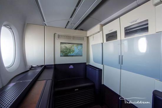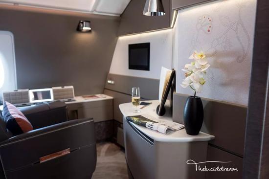 忘了提一点,也是最重要的。空中官邸座位最多可以容纳两名乘客,这也是目前全球唯一一个可以对多人售票的舱位。