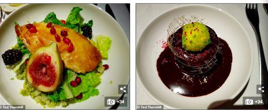 主菜是无花果配珍珠鸡,甜点则是巧克力慕斯蛋糕。