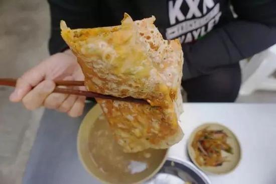 外酥里嫩鲜咸可口的烙馍配上柔软的鸡蛋,再配上两块一碗的面筋汤无敌。